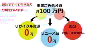 当社では事業ごみを3R完結に基づき、リユース品・リサイクル品・廃棄物に分け、処分費を大幅カットするお手伝いをさせていただいております。